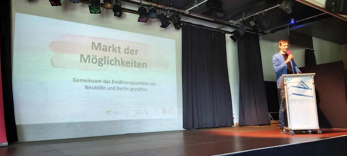 Am 3. Juni trafen sich rund 80 Menschen in der Gropiusstadt beim „Markt der Möglichkeiten“ (Organisiert von Johanna Clintworth von den Ernährungscoaches) im Gemeinschaftshaus. Alle wollten wissen: Wie schaffen wir mehr gesunde und nachhaltige Ernährung?