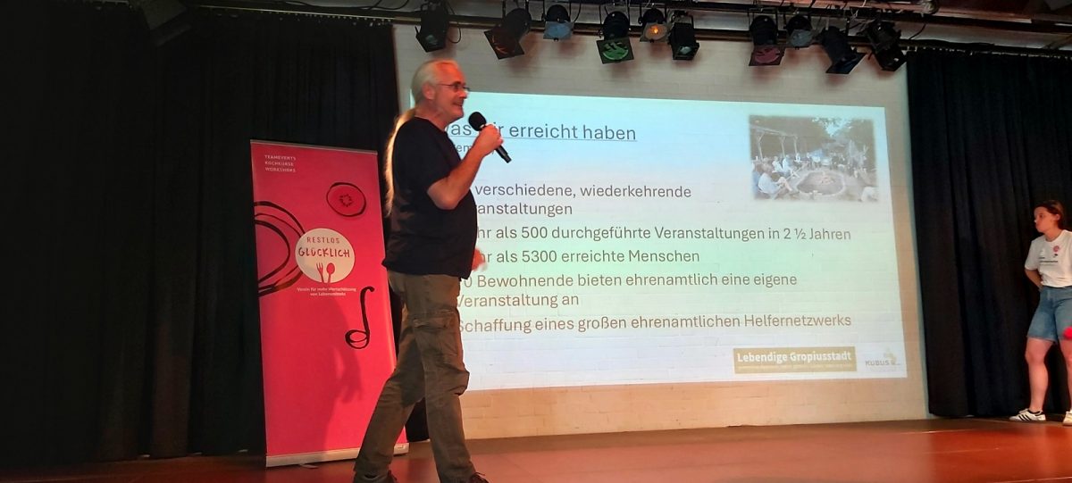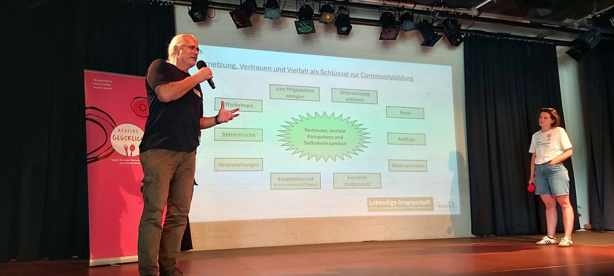 Ein tolles Beispiel ist das Waschhaus-Café: Dort gibt es einen (von „Lebendige Gropiusstadt“ mitentwickelten) LebensMittelPunkt. Man kann Lebensmittel in einem Fairteiler ablegen oder von dort mitnehmen, zusammen kochen und nette Leute treffen. Neu ist auch das Format „Küche für alle“.