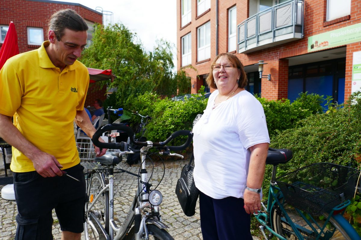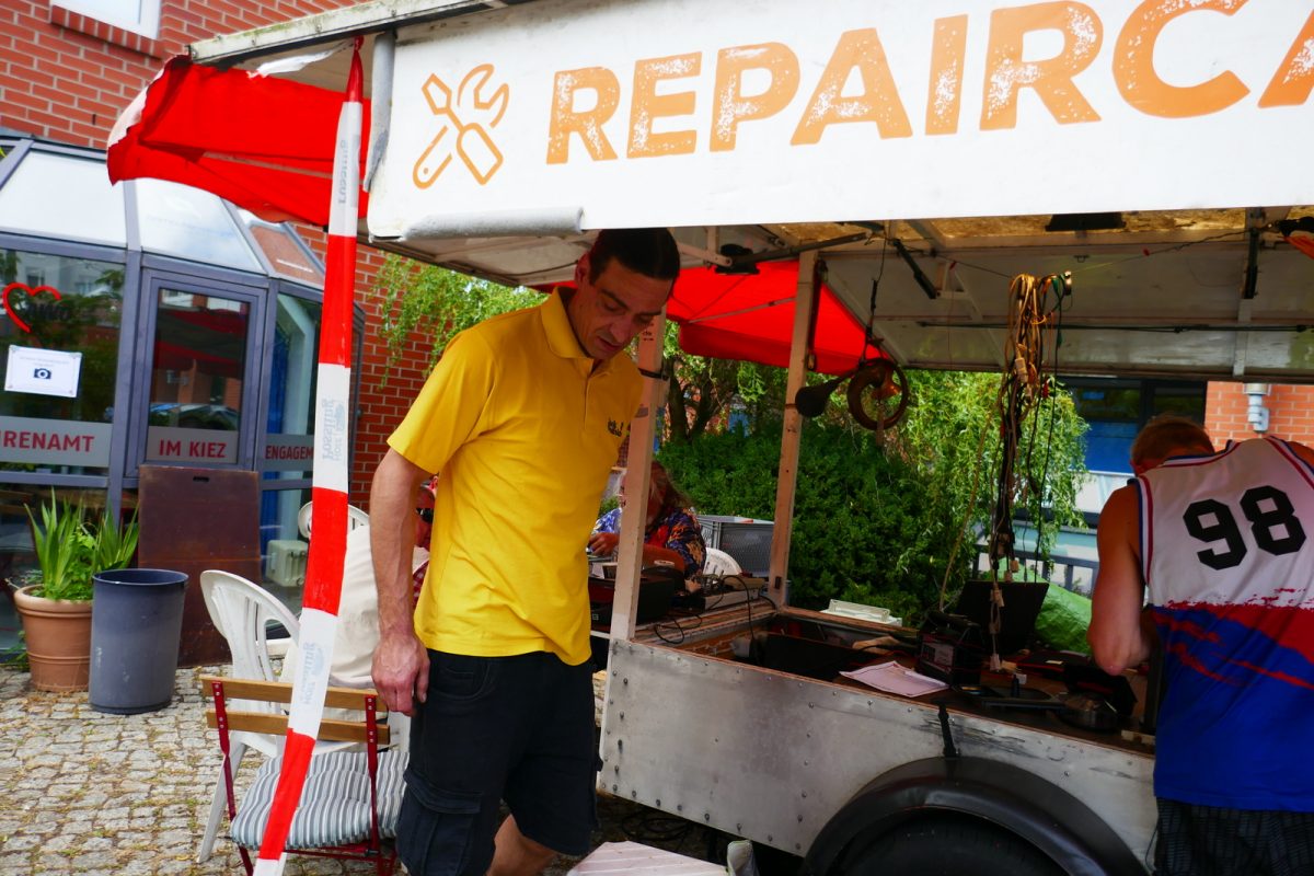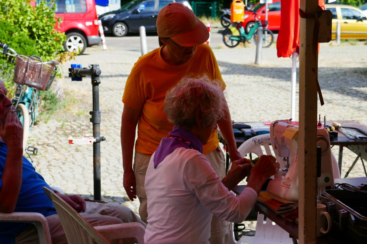 Beim letzten Repaircafé auf dem Platz an der Jungfernmühle wurde wieder geschraubt, genäht und gefachsimpelt, was das Zeug hält. Zahlreiche Besucherinnen und Besucher kamen mit kaputten Geräten oder kleinen Haushaltsgegenständen vorbei – und viele von ihnen konnten mit einem reparierten Lieblingsstück wieder nach Hause gehen. Immer wieder erklang die große Glocke und die Hupe, die jedes Mal betätigt werden, wenn eine Reparatur erfolgreich war.