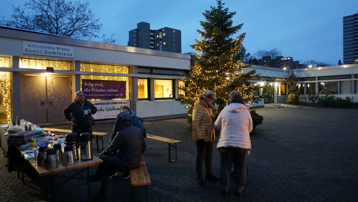 Vor der Dominikus-Kirche am Lipschitzplatz hat der Gropiusstadt-Stammtisch wieder einen kleinen, feierlichen Ort für die Adventszeit geschaffen. Liebevoll geschmückt strahlten Lichter und Dekorationen und luden Nachbarinnen und Nachbarn ein, vorbeizukommen, zu verweilen und die vorweihnachtliche Stimmung zu genießen.