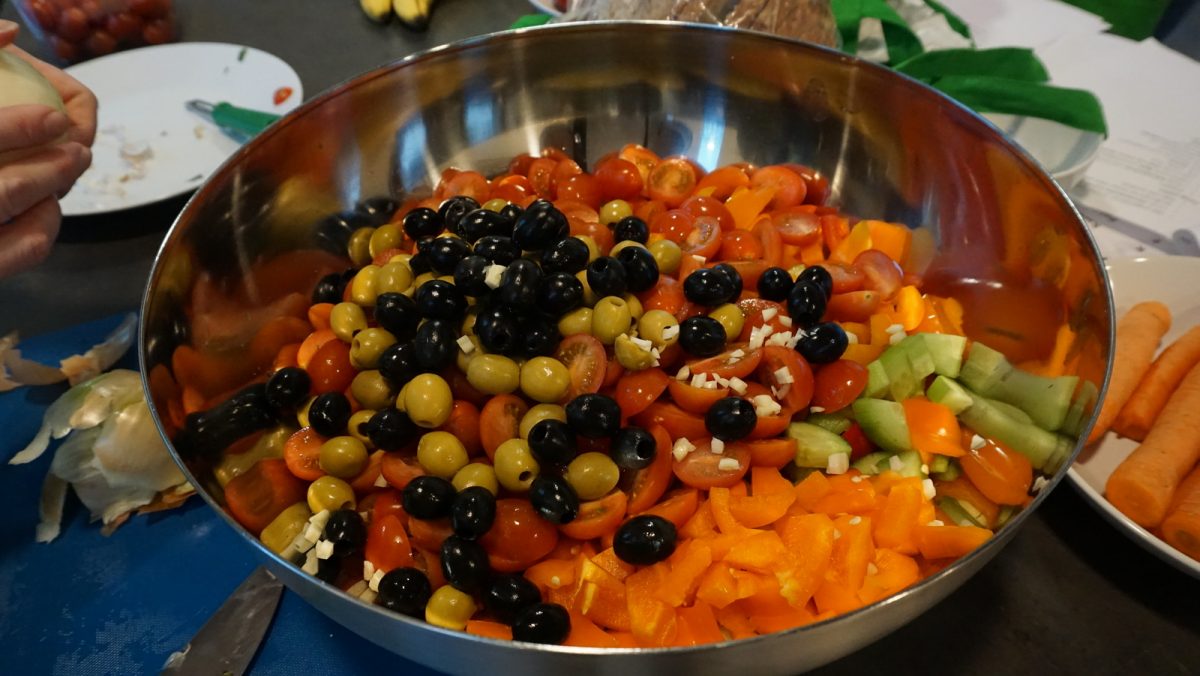 Pünktlich um 18:00 Uhr stand das Essen auf dem Tisch. Es duftete nach Chili sin Carne, knusprigen Zucchini-Kartoffel-Karotten-Röstis, frischem griechischen Bauernsalat und würzigem Karottensalat. Und ja – es war wirklich alles sehr, sehr lecker! Der Fritzitreff zeigte sich dabei wieder als wunderbarer Ort für Begegnung, Austausch und gemeinsames Tun.