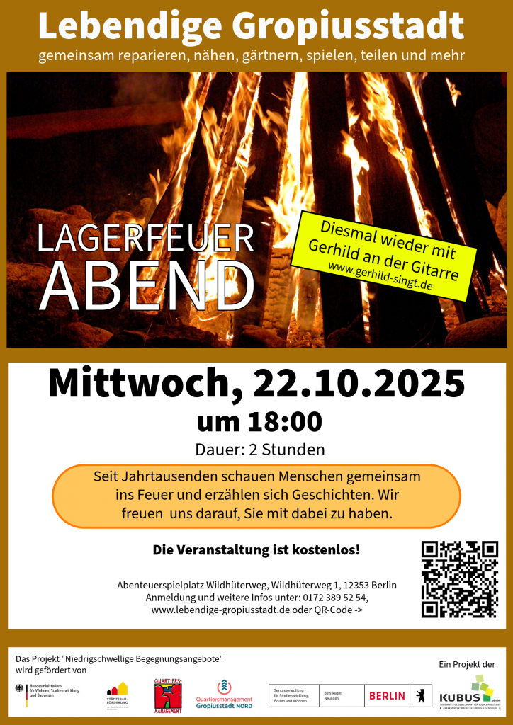 Mi22Okt18:00Mi20:0018:00 - 20:00 Lagerfeuerabendgemeinsam mit Gitarrenmusik ums Feuer sitzenAbenteuerspielplatz Wildhüterweg, Wildhüterweg 1, 12353 BerlinEvent Typ Austausch