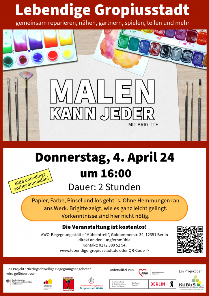 Do04Apr16:00Do18:0016:00 - 18:00 Malen kann jedermit BrigitteAWO-Mühlentreff, Goldammerstraße 34, 12351 BerlinEvent Typ Spielen & Basteln