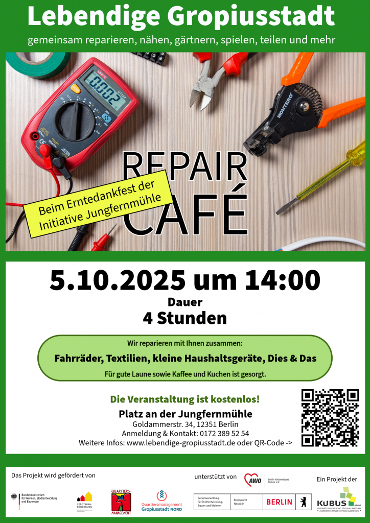 So05Okt14:00So18:0014:00 - 18:00 RepaircaféReparieren statt wegwerfen!Platz an der Jungfernmühle, Goldammerstraße 34, 12351 BerlinEvent Typ Reparieren & Handarbeit